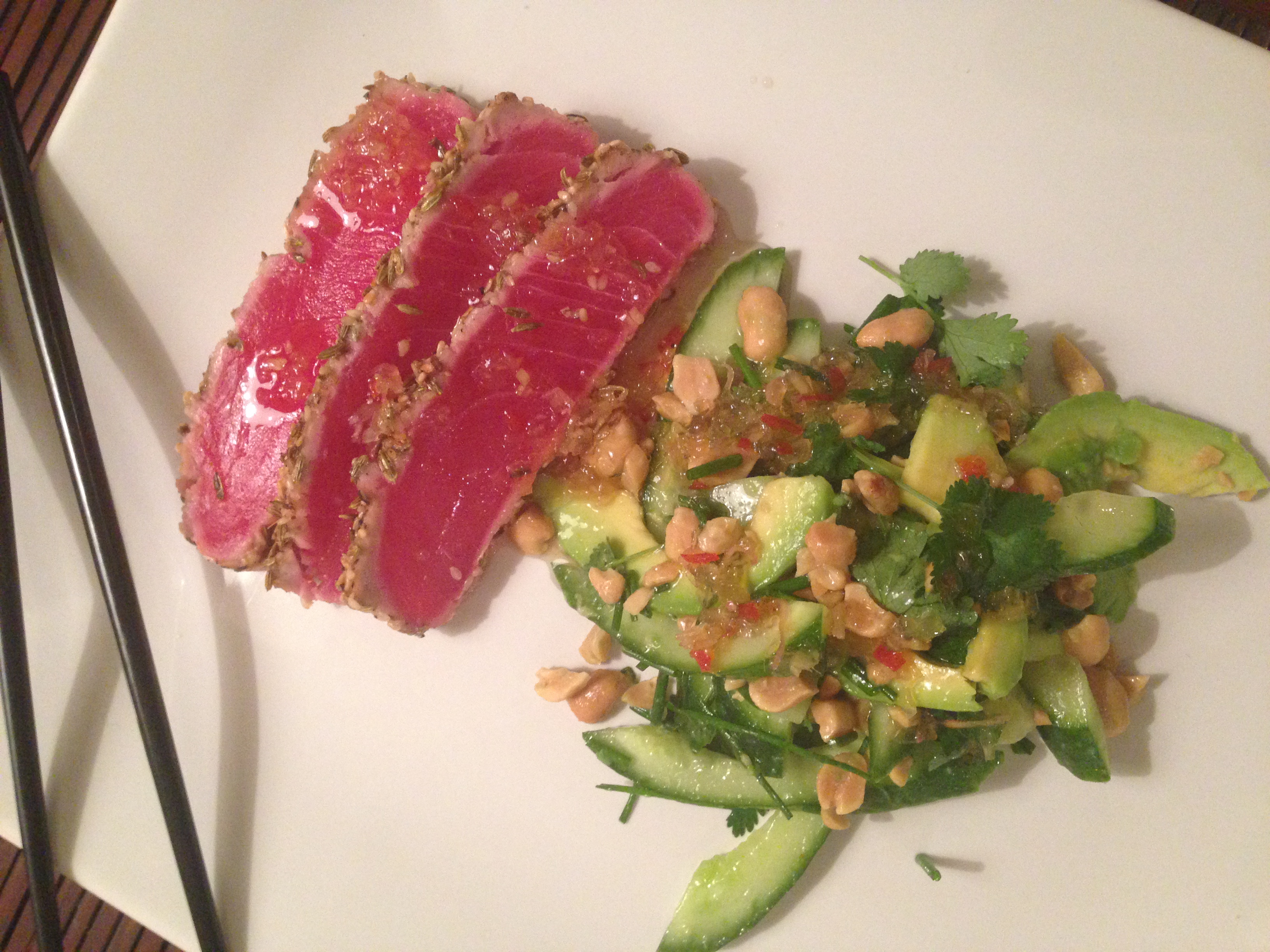 Blanda sesamfrön, lite flingsalt, svartpeppar och några fänkålsfrön (inte nödvändigt, men ger en spännande touch) på en tallrik. Vänd sedan tonfisken i blandningen så det fastnar på den lätt tinade ytan. Stek sedan snabbt alla sidor på fisken så det blir en krispig yta, men fisken skall vara rå inuti och det förblir den eftersom den är fryst. Skiva upp tre skivor per tallrik och lägg upp och låt ”tina klart” på tallriken. Gör en sallad på avocado, urkärnad gurka, hackade jordnötter och gräslök. Pressa en lime över och blanda ihop. Lägg upp salladen på tallriken och ringla lite av dressingen över salladen och fisken.