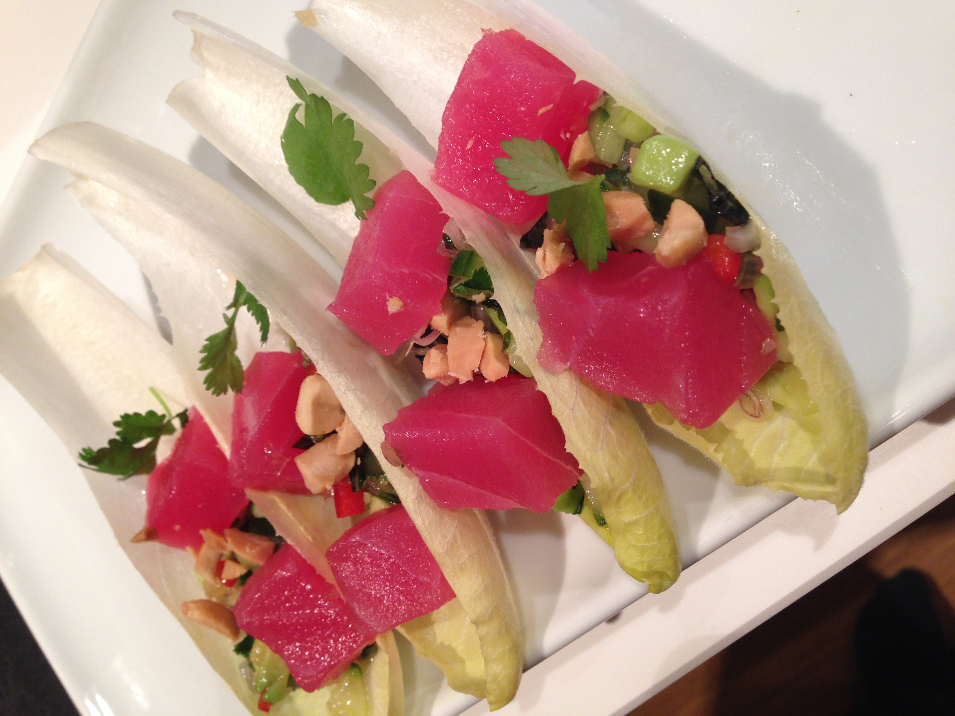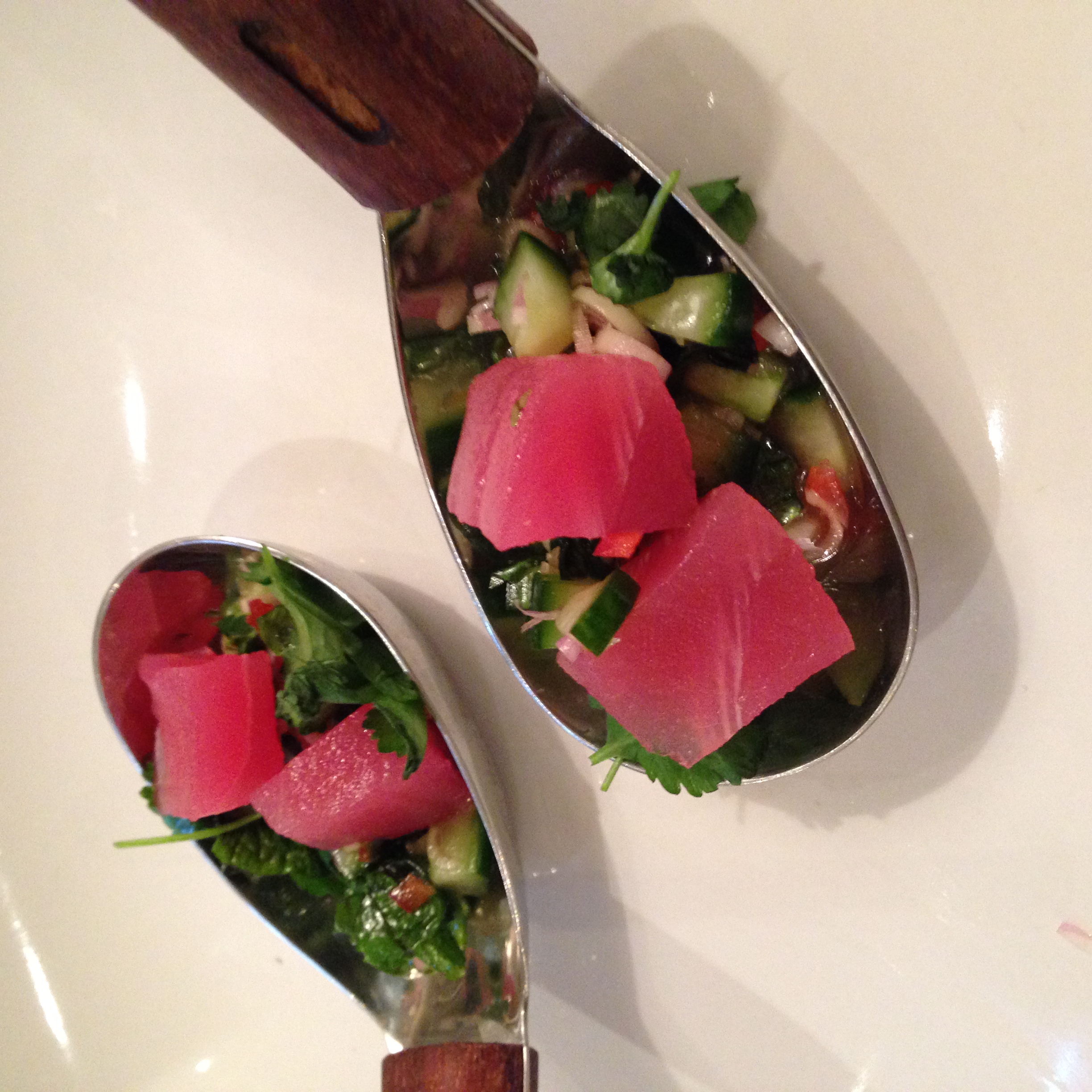 Det är kul att kunna servera två variationer av tonfisk när man ändå håller på. Gör en liten sallad på tränad gurka, tunt strimlad citrongräs, vårlök, schalottenlök, thaibasilika, mynta och koriander och röd strimlad färsk chili. Blanda med lite av dressingen och lite pressad lime. Se till att chilin ger styrka till minisalladen. Lägg upp på en sked eller exempelvis ett endiveblad. Toppa gärna med lite hackade jordnötter eller cashewnötter. Skär vackra kuber av rå tonfisk och servera några munsbitar per person. Det här ska vara en tugga per sked så lite sallad i botten under fisken. Supergott och snyggt. Färgen på den här vackra fisken är så läckert röd att man kan missta den för vattenmelon. Den här rätten serverades vi på vårt hotell i Chiang Mai.